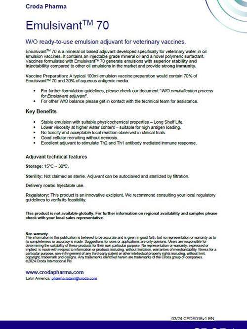 Emulsivant™ 70 es un adyuvante formulado con aceite mineral, especialmente desarrollado para vacunas veterinarias que utilizan emulsiones de agua en aceite. Su composición incluye un aceite mineral de...