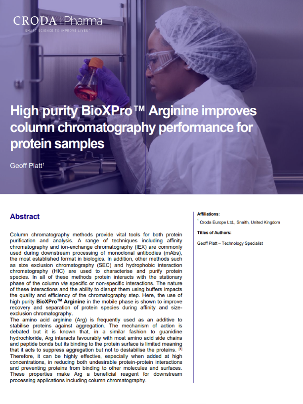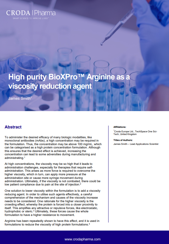 Os aminoácidos BioXPro™ da Croda, fabricados sob cGMP e com conformidade multi-compendial, apresentam níveis ultrabaixos de metais e endotoxinas, reduzindo qualquer potencial variação de desempenho e resultando em alta qualidade e maior consistência entre lotes para uma ampla gama de aplicações farmacêuticas.
